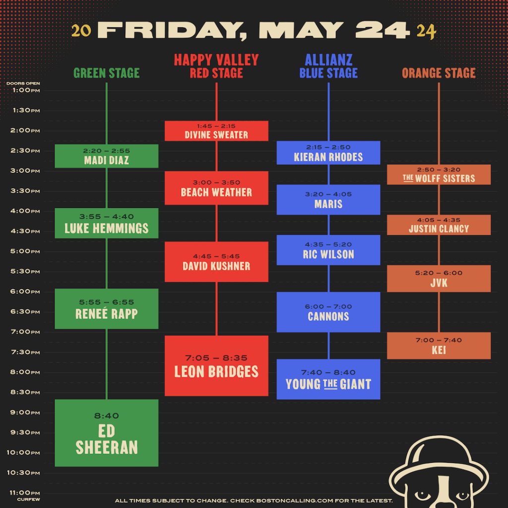 The day starts off today, Friday, with a set by Divine Sweater on the Red Stage. The day also continues with artists like Luke Hemmings, Renee Rapp, Young the Giant, Leon Bridges, and is headlined by Ed Sheeran.