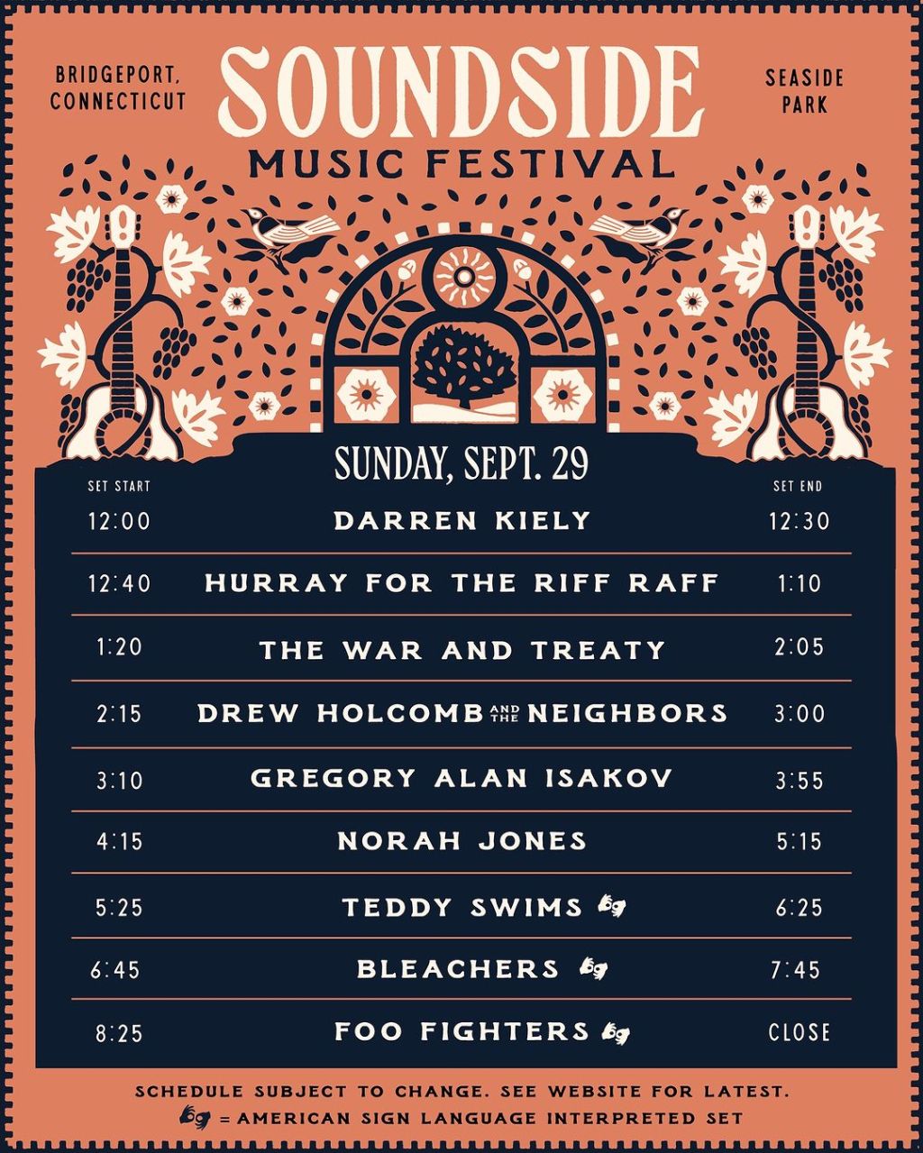 Foo Fighters close out the festival with a two-hour marathon set, with Bleachers, Teddy Swims, Norah Jones, Gregory Alan Isakov, and others joining the day.