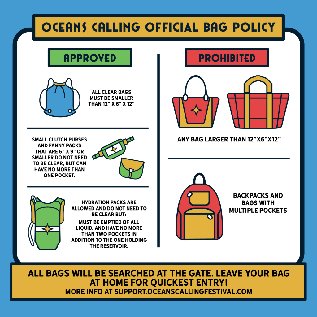 Make sure you know what you can and can’t bring into the festival. The Oceans Calling bag policy is similar to other festivals around the country.